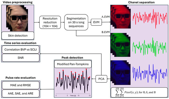 Figure 1 briefly summarizes the proposed algorithm for PR assessment. The complete code is implemented in Python version 3.11.0 (Python Software Foundation, Wilmington, DE, USA) within the Integrated Development Environment (IDE) Spyder [19], as well as in the MATLAB program version 2023a (The MathWorks, Natick, MA, USA). The following Python libraries are used for the realization of this research: NumPy [20], OpenCV [21], SciPy [22], Scikit-Learn [23], and math [24]. After loading the video recording, the detection of the subject’s face is performed in each frame of the video recording. Following this step, the eyes are detected in the previously extracted facial region and only the region of interest (ROI) is kept, i.e., the subject’s face without eyes. Once the ROIs are extracted for each frame, we create new videos from loaded frames, containing only ROI. The next step is the creation of 30 s long video sequences from the previously obtained video containing the ROI. Further, for each obtained video, in the first case, we apply EVM and extract the Signal of Change in Light Intensity (SCLI) that corresponds to the blood flow, while in the second case, we proceed with processing without applying EVM to extract SCLI. The final step involves the detection of peaks that correspond to the heart beats by applying a modified Pan–Tompkins method.