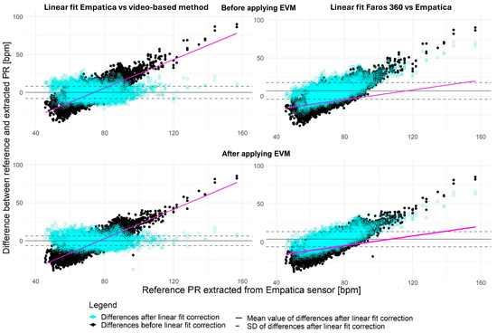 For the sake of scientific rigor and with the aim to avoid any possible biases that may be introduced by video-based PR assessment, we use data shared with us by Medarević et al. [66]. Thus, we assess linear fit related to the PR increase when Empatica E4 measurements are compared against PR measurements from the Faros 360 [67]. A similar trend is observed between Empatica E4 and Faros 360 (FARO Technologies Inc., Lake Mary, FL, USA), although the correction of such a linear trend introduced less changes in our dataset (graphs on right-hand panels in Figure 2). In our case, a simple linear fit correction is applied, with parameters a and b in the basic linear equation , which are 0.94 and −69.41 for B.EVM as well as 0.96 and −74.01 for A.EVM, respectively, effectively reducing observed deviations. A similar linear trend was recorded between the data from Empatica E4 and Faros 360 devices presented in [66], where the parameters of the linear fit were 0.32 and −30.42. The left-hand panel in Figure 2 presents the linear fit designed onto our data. The differences between the extracted PR from the video recording and the reference PR from Empatica E4, in both B.EVM and A.EVM cases, are shown as dark circles. Lighter circles represent the corrected differences between reference and extracted PR after subtracting the linear fit from the data depicted by the black circles. Further analysis is performed on both corrected (linear fit correction designed for our data and linear fit correction based on data from [66]) and uncorrected values to examine the effectiveness of eliminating deviations between reference and extracted PR values.