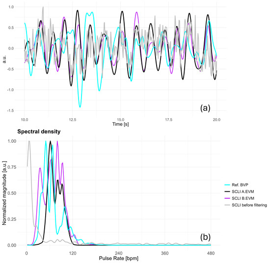 In Figure 3, we present time-series obtained together with spectral density, which is estimated using the periodogram with Bartlett smoothing, from a single subject participating in the first study. These include the reference BVP signal, as well as the SCLI B.EVM and SCLI A.EVM signals extracted from the video recording.