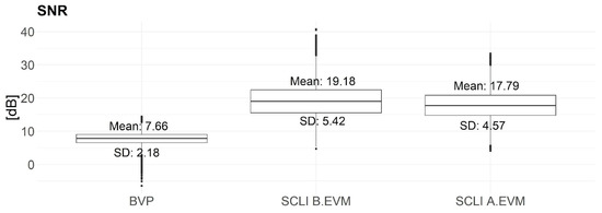 The average and standard deviations of the SNR values for corresponding BVP signals obtained from Empatica E4 sensors and SCLI (B.EVM and A.EVM), computed for all video sequences of all subjects, are shown in Figure 4. The results demonstrate that in all measurements, SCLI has a higher average SNR than BVP signal.