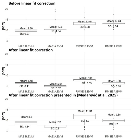Comparison of PR values obtained from the Empatica E4 sensor and PR extracted from the SCLI B.EVM and the SCLI A.EVM before and after linear fit correction. The upper panel presents MAE and RMSE before linear fit correction, while lower panel displays MAE and RMSE after linear fit correction. MAE—Meana Absolute Error, RMSE—Root Mean Square Error, B.EVM—Before applying Eulerian Video Magnification, A.EVM—After applying Eulerian Video Magnification [66].