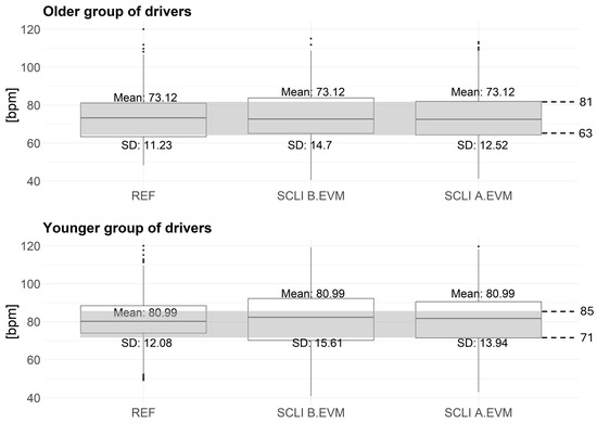 Figure 6 shows the PR values extracted for two groups of participants (older and younger groups of drivers), after linear fit correction designed onto our data. PR ranges by age categories (older and younger) from the literature are marked in gray [75]. According to the values obtained from the reference BVP signal from Empatica E4 sensor, a difference in the average PR can be observed (for the older group, the average extracted pulse value is 73.12 bpm, while for the younger group, it is 80.99 bpm). Statistical tests presented in Table 2 indicate a statistically significant difference between these two groups of participants based on the reference BVP signals and also based on SCLI (B.EVM and A.EVM), with and without linear fit corrections.