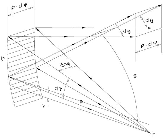 Figure 2 shows the necessary details and notations for the optical calculations. To simplify the computation effort, we can make a convenient choice of the system axis, the angle measurement convention for the position vectors of the incident beam , with magnitude . The angles of the radiation directions of the reflected beam , as they result from the optical calculation, are a function of the angle of the current position vector in the incident beam , the limits of the incident beam, and the limits of the reflected beam, namely . The solid angle of the incident beam is suggestively depicted with the position vector at an angle of incidence from the reference point F (where the primary radiation source is positioned) onto a very narrow surface element around the curvature in the reflector’s plane of symmetry. Additionally, the corresponding reflected beam for the angle of reflection is shown with its aperture and width .