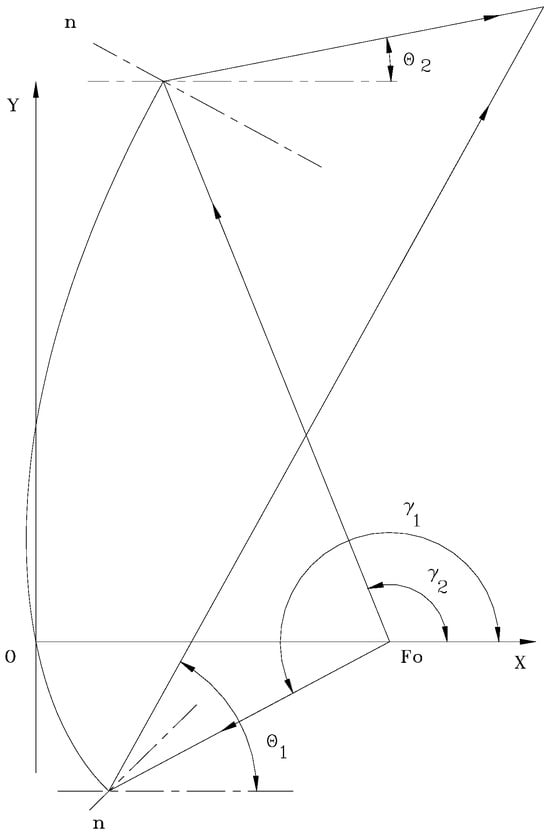 Considering that the focus is placed on the x-axis at a distance from the origin, the curve is generated in the right semi-plane, thus is in the second quadrant and is in the first quadrant. Therefore, the angles are positive, in the first quadrant with values as shown in Figure 3. It results