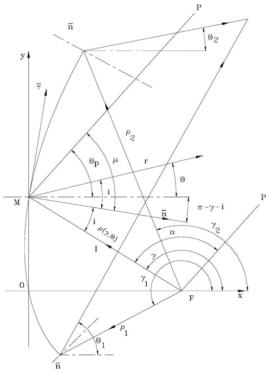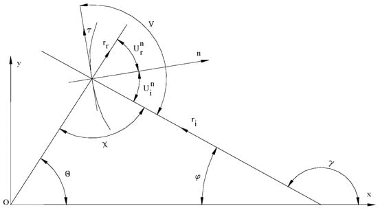 In Figure 4, the angle notations and conventions are presented for the position vectors corresponding to the incident ray , the reflected ray in relation to the normal , and the tangent to the curve in the symmetry plane at the incidence point. These notations are necessary to evaluate the relationship between the tangent angle to the curve in the plane of symmetry in the incidence point of V, the angle of incidence , the angle of reflection , and the incident, , and reflected, ray angles to the characteristic in the plane of symmetry.