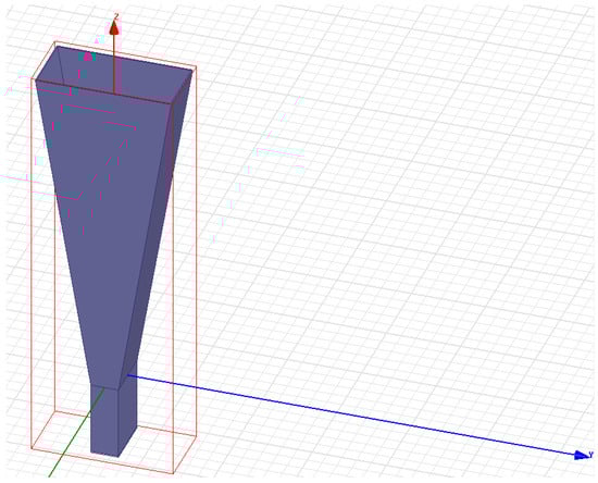 In Figure 7, an example of a sectoral horn antenna with linear polarization in the E-plane is presented, which can be used to illuminate a reflector generated with the curve from the symmetry plane defined by Equations (22)–(25), (28), and (29). The sectoral horn antenna shown in the Figure is prepared to simulate the radiation characteristics using the finite element method on the Ansys HFSS platform. For this simulation the following setting shave been used: HFSS Driven Modal, Material: pec, Boundaries: Perfect E1/Radiation/vacuum/Radiating Only, Excitation: Wave port/Properties/General Name: 1/Modes: Number of modes1, Integration line: defined, Characteristic impedance Z0: Zpi/Mode Alignment and Polarity: Set mode polarity using integration lines.