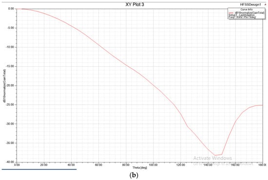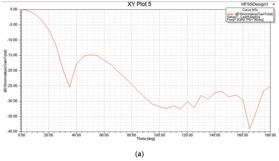 In Figure 13a, the simulation result is presented when = 70° and = 4°. A good approximation to the ideal curve (represented in red) is observed for angles between 4° and 7.5°, as well as for large . A reduction in the angle of maximum radiation direction is observed. This represents a suitable directivity characteristic for radars that detect and track targets with medium-altitude flight ceilings. In Figure 13b, the simulation result is presented for the case where = 70° and = 4°, with representation in polar coordinates of the vectors to obtain a dependence of height vs. distance . It is easy to observe the reduced level of the lobe near the limit value of the angle (dead cone).