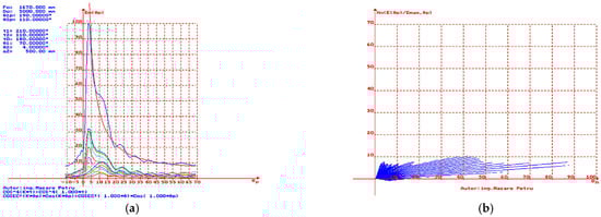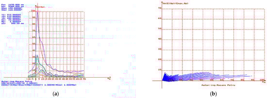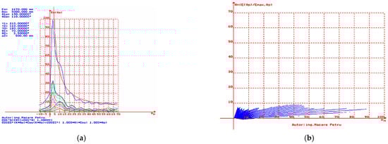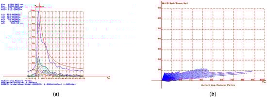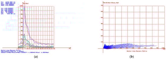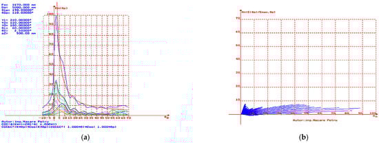 Using the method presented above, developed in the numerical calculation and graphical modelling program DIAGCCOS.PAS in Turbo-Pascal 7.0, we performed the simulation of the normalized electric field distribution at the maximum value (where: is given by (39), Emax is the maximum value of and the vectors and the angles in accordance with (21–29) are calculated numerically by ANCSCCO4.PAS. The DIAGCCOS.PAS program is created for a double curved reflector (graphite material), with a sector horn type primary radiation source with characteristic , to obtain the characteristic , for a wavelength of 10.6 cm and vertical polarization.