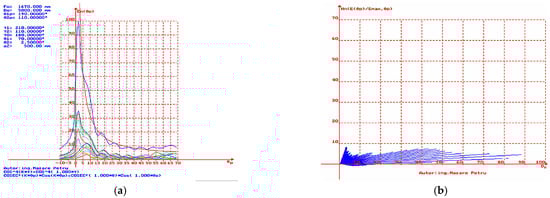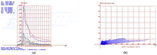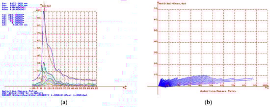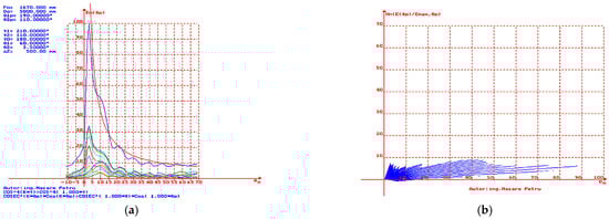 In rectangular coordinates, the variation of the resultant electric field for each angle of the measurement direction (in degree) is represented, normalized to its maximum value in percents, where is given by (39) and the values for and are determined using the program ANCSCCO4.PAS. In this representation, the blue curve depicts the variation of the resultant electric field normalized to the maximum value, and the red curve represents the ideal curve, and the smaller-scale curves at the bottom, each with different colors, represent the synthetic contribution to the resultant field for each section in the vertical plane with step Δz in the horizontal plane, thus providing information on the possibility of modification for the surfaces that could be eliminated for reflector surface optimization.