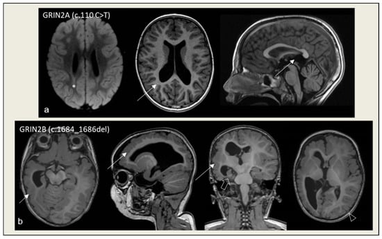 - Brock, S.; Laquerriere, A.; Marguet, F.; Myers, S.J.; Hongjie, Y.; Baralle, D.; Vanderhasselt, T.; Stouffs, K.; Keymolen, K.; Kim, S.; et al. Overlapping Cortical Malformations in Patients with Pathogenic Variants in GRIN1 and GRIN2B. J. Med. Genet. 2023, 60, 183–192. [Google Scholar] [CrossRef]