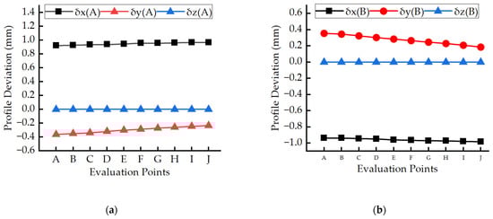This completes the motion error modeling of each axis of the rolling machine tool. The 24 machine tool motion error terms and the 4 motion instruction matrices , , , and in Formulas (17)–(20) are obtained by substituting the 24 machine tool motion error values and the motion amount into Formulas (28)–(31).