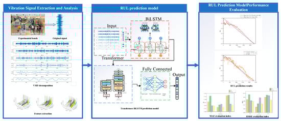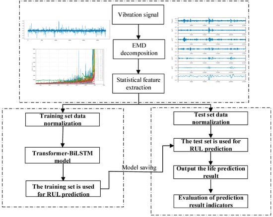 The procedure for predicting the RUL of rolling bearings based on the proposed method is illustrated in Figure 7. First, the collected vibration signals are subjected to EMD to extract components of different frequency bands, and feature inputs are constructed by combining statistical feature extraction methods. Subsequently, the training dataset is normalized and fed into the Transformer–Bi-LSTM hybrid model for training. The model parameters are optimized iteratively by minimizing the loss function to improve prediction accuracy, and the optimized model is saved. For the testing dataset, the data are also normalized and then input into the pre-trained model for RUL prediction. Finally, the prediction results are smoothed and evaluated to validate the model’s performance and reliability.