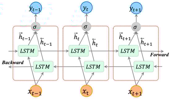 The Bidirectional Long Short-Term Memory (Bi-LSTM) network is an architectural enhancement of the unidirectional LSTM. As illustrated in Figure 3, a Bi-LSTM consists of two hidden LSTM layers that share the same input but process information in opposite temporal directions. This specific structure enables Bi-LSTM to capture temporal dependencies by propagating information both forward and backward through the sequence. Unlike traditional LSTM, which can only access past information, Bi-LSTM integrates both past and future contextual information along the temporal axis, thereby providing a more comprehensive feature representation. This allows the network to better interpret sequential data and enhances its ability to extract meaningful temporal features for improved predictive performance.