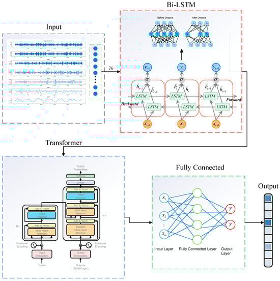 A Bi-LSTM–Transformer model is proposed, and its structural diagram is shown in Figure 6. In this model, the input data is first fed into the Bi-LSTM network, which consists of a forward LSTM and a backward LSTM model. Through the bidirectional structure, temporal dependencies within the input sequence are effectively extracted. Subsequently, the output from the Bi-LSTM is passed into the Transformer network for further processing. In the Transformer module, the data is first encoded through an input embedding layer, mapping it into a high-dimensional feature space. Then, the encoder and decoder modules model the global features of the sequence using a self-attention mechanism, capturing long-range dependencies between different positions within the sequence and emphasizing critical information in the input features. Finally, the features processed by the Transformer are mapped through a linear layer to produce the model’s prediction output.