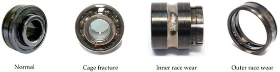The XJTU-SY [] bearing dataset was used in the experiments, and the test platform is shown in Figure 9. The test bearings were LDK UER204 rolling bearings. The accelerated degradation experiments conducted in this study involved three types of faults: outer race faults, inner race faults, and cage faults. A schematic diagram comparing normal and faulty bearings is presented in Figure 10.