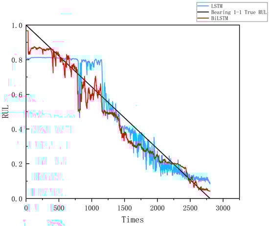 To illustrate the advantage of adopting a bidirectional Long Short-Term Memory (Bi-LSTM) architecture over a one-way LSTM, we conducted a comparative experiment on the PHM1-1 bearing. In this experiment, the combined time-domain features extracted from all IMFs components of Bearing 1_1 were used as input. As shown in Table 6 and Figure 15, the Bi-LSTM achieved lower prediction errors compared to the one-way LSTM. This confirms the effectiveness of the bidirectional approach in capturing temporal dependencies within degradation signals, whereas a one-way LSTM is less capable of fully modeling complex sequential patterns.