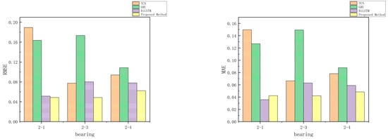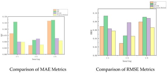 Table 10 and Figure 19 and Figure 20 report the comparative prediction results of the proposed method against TCN, GRU, and Bi-LSTM under Operating Condition 2 of the XJTU-SY dataset. It can be observed that the proposed method consistently achieves lower MAE and RMSE values across all test bearings, thereby demonstrating enhanced predictive accuracy and robustness.