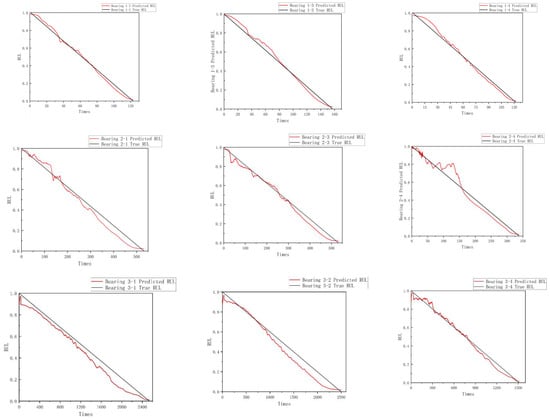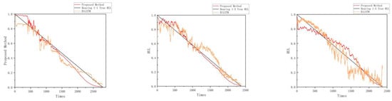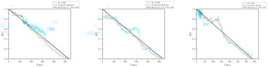 To verify that the model trained on the training dataset can be effectively applied to the testing dataset, we divided the dataset as shown in Table 5. The feature extraction layers and parameters of the Bi-LSTM–Transformer model were frozen in each of the three experiments, preserving the model’s feature extraction capability. The top layers of the model were then retrained. This approach aims to validate the transferability and generalization ability of the learned feature representations. After 100 additional training epochs on the testing dataset, the results are shown in Figure 14. The experimental prediction results demonstrate that the proposed Transformer–Bi-LSTM model can accurately capture the degradation trends of bearings. The predicted RUL curves exhibit a strong consistency with the ground truth, thereby validating the effectiveness and reliability of the proposed approach.