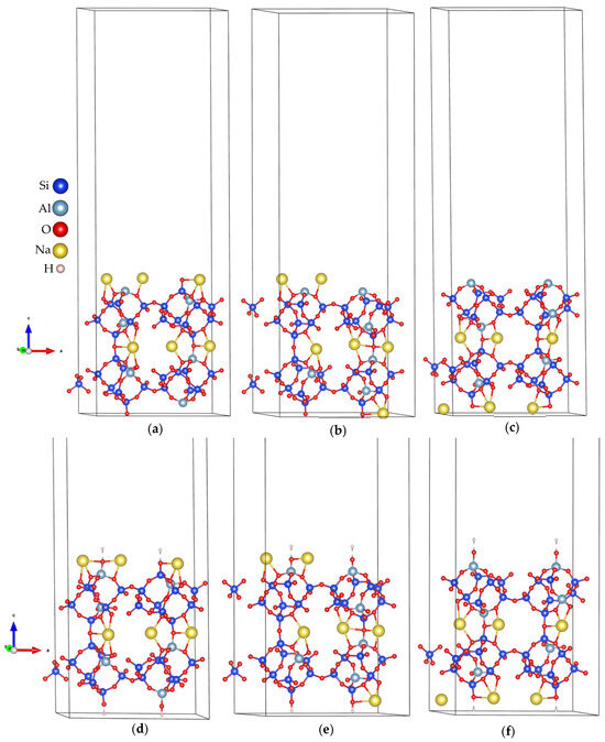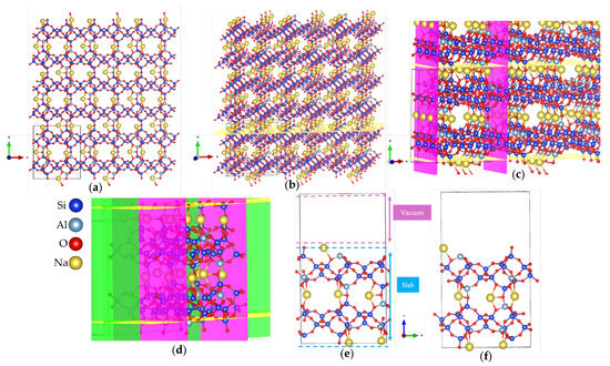 - Export the resulting model in Vienna Ab initio Simulation Package (VASP) format with Cartesian coordinates, which facilitates the addition of vacuum spacing (usually along the z-axis) for subsequent DFT calculations. Some resulting models are shown in Figure 3e,f for the (010) plane.
