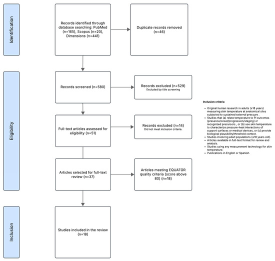 We included observational studies, clinical trials, and methodological studies that assessed skin temperature by any thermal method, relating it to the risk, diagnosis, or progression of pressure injuries. Systematic reviews, animal studies, isolated case reports, research protocols, technical articles without clinical application, and studies without full-text access were excluded. Only studies meeting at least 80% of the methodological quality criteria were selected. The study selection process involved three phases: (1) title and abstract screening, (2) full-text review, and (3) methodological quality assessment. Two independent, blinded reviewers conducted the selection process. Discrepancies were resolved by consensus or, if necessary, by a third reviewer. The entire selection process was documented using a PRISMA 2020 flow diagram [18], presented in the results section.