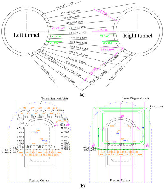 To meet safety and quality standards, the frozen curtain must maintain a minimum effective thickness of 2.0 m, and its average temperature must remain below −10 °C. In this project, 73 freezing holes were drilled, with depths ranging from 3.60 m to 12.00 m, and all freezing pipes were specified as φ89 × 8 mm in diameter. Figure 2 shows the arrangement of the freezing holes and other holes. Most freezing holes were drilled from the left tunnel (designated N and Z), with a total of 16 rows, while three rows were drilled from the right tunnel (designated W and Z). The horizontal spacing between the freezing holes at the top and bottom (N1, N2, N14, N15, W1, and W2) is 800 mm, with local spacings of 700 mm and 750 mm, respectively. Additionally, eight thermometer holes (designated C) were placed to monitor and record temperatures at various ground positions, while four pressure-release vents (designated X) were installed to measure and release pore water pressure in the unfrozen zone after the frozen curtain had closed.