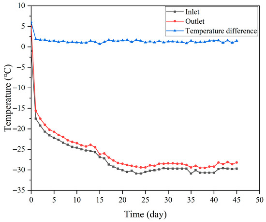 Since the freezing station began operation, brine temperatures at both the outlet and inlet were monitored hourly using thermometers installed in the pipeline. Figure 4 illustrates the recorded brine temperatures. According to the records, the brine temperature decreased rapidly to below −18 °C within the first five days of freezing and stabilized below −24 °C by the 14th day. Prior to excavation, the brine temperature remained stable and met the design requirements, with the difference not exceeding 2 °C, indicating that the frozen curtain had reached a stable stage.