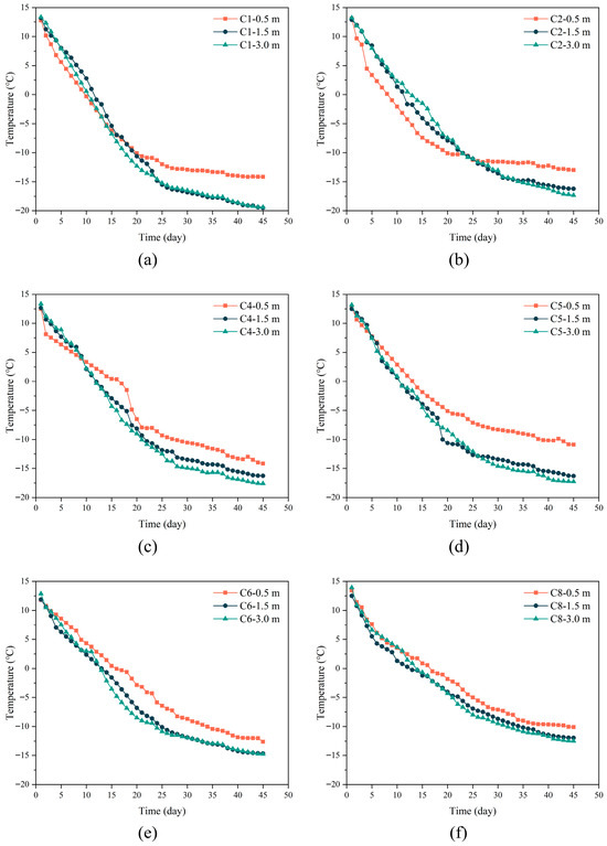 Due to equipment failure, the data from the C3 thermometer hole were incomplete, and the C7 hole, positioned separately, could not reflect the symmetry of the frozen curtain’s development. Therefore, thermometer holes C1, C2, C4, C5, C6, and C8 were selected for further analysis. As shown in Figure 5 and similar to the brine temperature trend, temperatures at all points exhibit three stages: rapid decline, slow decline, and stabilization. At the onset of AGF, the temperature difference between the soil and freezing pipe surfaces is significant, resulting in intense heat exchange and a rapid decrease in ground temperature. With the release of latent heat and the gradual decrease in the temperature difference between the soil and the freezing pipes, the cooling rate of the ground at most monitoring points significantly reduces after 25 days. As the frozen walls continue to expand, heat conduction within the strata gradually reaches equilibrium, causing the temperature to stabilize.