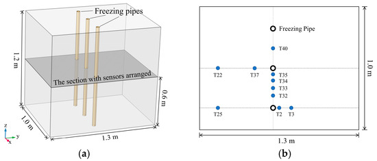 The experimental data from the literature were compared with the simulation results to validate the accuracy of the heat transfer model. Pimentel et al. developed a large-scale physical model with internal dimensions of 1.3 m × 1.0 m × 1.2 m. The exterior of the box was insulated, and three vertical freezing pipes were arranged in a straight line inside (Figure 6a). A series of temperature sensors was arranged at the middle height (ten representative sensors are shown in Figure 6b, represented by blue dots). The seepage velocity could be adjusted by altering the water heads on the left and right sides of the box. For further details on the experiment, refer to [12].