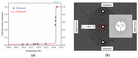 For saturated soil, frost heave deformation is not considered, and it is assumed that . Multiple estimation methods exist for the equivalent thermal conductivity , and in this study, the commonly used weighted geometric mean method is employed [16,27].