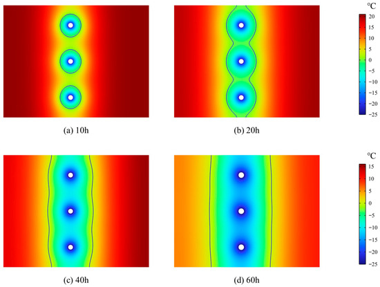 According to the simulation results, the closure time of the frozen wall is 15 h, which is very close to the measured 14.4 h, thereby confirming the validity of the model. Figure 8 shows the distribution of frozen walls at different freezing times on a cross-section at a height of 0.6 m, with solid black lines representing the 0 °C isotherms. In the absence of seepage, the temperature field is symmetrically distributed with the freezing pipe connection line as the axis.