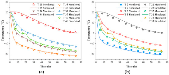 Monitored and simulated results at representative monitoring points: (a) Monitoring points T25, T34, T35, T37, and T40; (b) Monitoring points T2, T3, T22, T32, and T33.