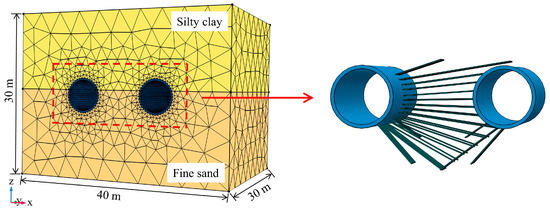 The strata in which the cross passage is located consist mainly of silty clay and fine sand, both simplified as homogeneous and isotropic materials in the model. According to the hydrogeological data, the hydraulic gradient of groundwater in this area is less than 2‰. Given the low permeability of fine sand and silty clay, the influence of seepage was neglected. The soil domain dimensions of the model were set to 40 m, 30 m, and 30 m in length, width, and height, respectively, to minimize boundary effects on the temperature field (Figure 10). The sides, top, and bottom of the model were set with Dirichlet boundary conditions at a temperature of 13 °C (286.15 K), based on the monitored initial ground temperature. The surfaces of the tunnel segments in contact with air were defined as adiabatic boundaries, expressed as . The heat transfer between the brine and freezing pipe walls was neglected to reduce computational costs. The freezing pipe walls were defined with Dirichlet boundary conditions for temperature, with the temperature load represented as an interpolation function based on the recorded brine temperature curve.