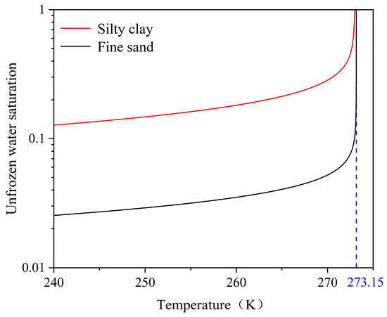 Considering the difference in saturated volumetric water content, unfrozen water saturation is used to represent the phase transition process in both soils. In Figure 11, along the negative direction of the horizontal axis (cooling direction), the estimated unfrozen water saturations of both soils exhibit a rapid decline, a slow decline, and eventual stabilization. Since the soils are saturated, once the freezing temperature is reached, a significant amount of free water freezes, causing a substantial reduction in unfrozen water saturation during the initial stage. Bound water begins to freeze as the temperature continues to decrease. The surface energy of soil particles reduces the free energy of bound water, thereby slowing down the freezing rate. Compared to fine sand, silty clay has a larger specific surface area and higher bound water content, causing the unfrozen water saturation to decrease more slowly, with the saturation remaining higher after reaching stability. The characteristics of the estimated SFCCs align with experimental findings as well [39].