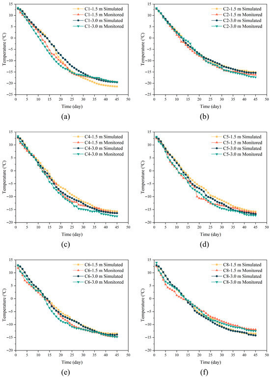 By comparing the monitored data from the cross-passage project with the numerical simulation results, the reliability of the model in AGF engineering can be further validated. Figure 12 presents the monitored and simulated temperature values at twelve representative monitoring points during the active freezing stage. Although the tunnel segments in the freezing area were insulated, most of the 0.5 m monitoring points were still influenced by airflow in the tunnel, leading to a slight temperature increase. Therefore, only the temperature curves at 1.5 m and 3.0 m are shown.