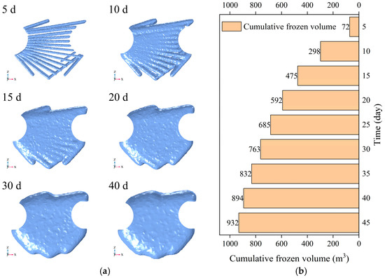 Simulated variation process of frozen curtain: (a) Variation in frozen curtain shape with time; (b) Cumulative frozen volume against time.