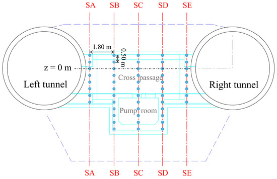As shown in Figure 14, five vertical cross-sections (SA to SE) are arranged in parallel at 1.80 m intervals between the tunnels to investigate the development and key indicators of the curtain from a three-dimensional perspective and to identify relatively weak areas. Section SC is located in the middle of the line connecting the centers of the two tunnels, where the cross-sectional area of the frozen curtain is the largest. Sections SA and SE are located at the junctions of the passage and the tunnels. Therefore, the development of the curtain at these locations is critical for excavation. Sections SB and SD are auxiliary sections located on either side of SC.