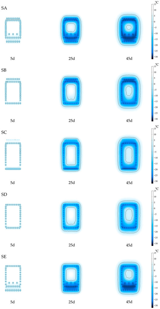 It is evident that the larger the spacing between freezing pipes, the longer it takes to form a continuous frozen wall. Since two rows of freezing pipes intersect at the bottom of section SC, and the spacing is half that of the other four sections, a flat frozen wall appears here on day 5. Similarly, on section SA, continuous frozen walls form on both the left and right sides, as the radially arranged side freezing pipes are relatively close to one another. Due to the increased spacing between side freezing pipes, the continuous frozen walls appear later on both sides of the remaining four sections.