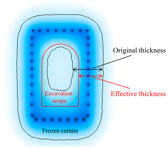 Schematic diagram of the original thickness and effective thickness of the frozen wall.