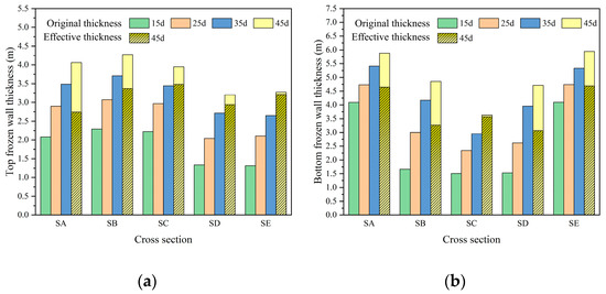 Thicknesses of top and bottom frozen wall on different sections: (a) Top frozen wall thicknesses; (b) Bottom frozen wall thicknesses.