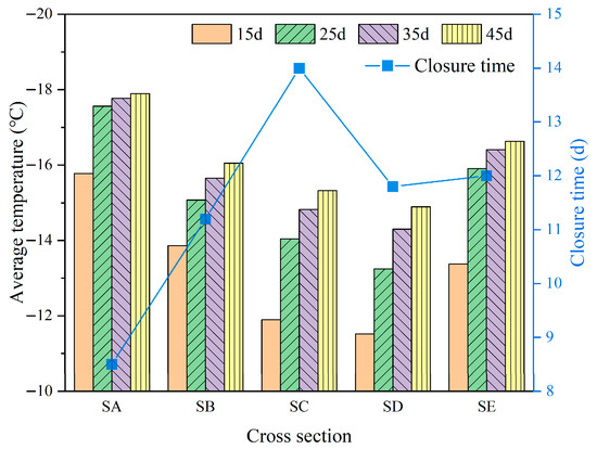 The average temperatures of the frozen curtain at various freezing times for each section were calculated using the integral method and plotted in Figure 19, along with the corresponding closure times. The development trend of the average temperature shows a clear inflection point around day 25. After day 25, the rate of decrease in the average temperature slows. Although the final average temperature on each section is below −10 °C, section SD has the highest temperature, followed by section SC. Furthermore, due to the large spacing between pipes and the greater cross-sectional area of the curtain, the frozen curtain closes last on section SC. Therefore, it is recommended to closely monitor the development of the frozen curtain at the center and slightly right areas of the cross-passage axis, and optimize the layout of side freezing pipes near the pump room by adding more pipes or reducing pipe spacing.