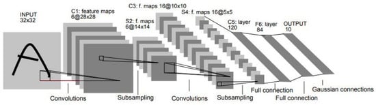 In the field of machine vision, convolutional neural networks are the most widely used deep learning architecture, such as the LeNet-5 architecture shown in Figure 1 [15]. This architecture comprises three primary types of neural layers: convolutional layers, pooling layers, and fully connected layers. The convolutional layers are responsible for extracting local features from images, while the pooling layers reduce image dimensions and network parameters. The fully connected layers transform the two-dimensional image representation into a one-dimensional vector. Finally, the output layer, utilizing the Softmax function as the activation function, determines the network’s final prediction by selecting the neuron with the highest activation.