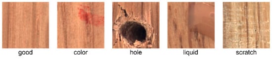 This study utilizes the wood category from the MVTec Anomaly Detection (MVTec AD) dataset [17,18,19]. The MVTec AD dataset comprises 15 categories with 3629 images for training and validation and 1725 images for testing. The training set contains only images without defects. The test set contains both: images containing various types of defects and defect-free images. Within this dataset, the wood category includes images of defects such as color anomalies, holes, liquid, and scratch, as illustrated in Figure 3. Table 1 presents the number of images for each type within the wood category, where “Good” represents defect-free. Note that MVTec AD dataset includes 247 defect-free images for training and validation and 19 images for testing. Therefore, the total number of defect-free images, as represented in the “Good” category (second row of the table), is 266.