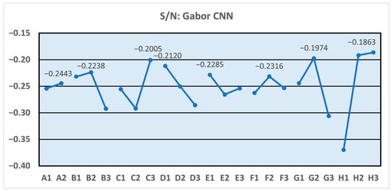 Based on the L18 orthogonal array and the recognition results of Table 4 (at the end of the paper), the S/N ratio for each experimental setup is listed in the last column of Table 3. The average S/N ratio of each factor and level is listed in Table 5. The higher S/N ratio represents the higher stability of the quality. The optimal parameter of each factor is also displayed in the last row in Table 5. Figure 4 presents the factor S/N ratio response plot, which illustrates the mean response values calculated for each control factor and its corresponding levels. Since the quality characteristic of this study follows the “larger-the-better” criterion, the optimal factor settings can be identified from the response plot in Figure 4 as follows: the pooling method is max pooling, the number of filters in the first convolutional layer is 256, the kernel size of the first convolutional layer is (7,7), the number of filters in the second convolutional layer is 128, the kernel size of the second convolutional layer is (3,3), the number of frequency components is 6, the number of orientations is 4, and the number of phase offsets is 3.