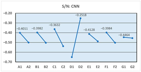 The average S/N ratio of each factor and level, along with the optimal parameter of each factor, is presented in Table 9. Additionally, Figure 5 depicts the corresponding Taguchi response plot, which illustrates the mean response values calculated for each control factor and its associated levels. Based on these results, the optimized control factors for the CNN are identified as follows: the pooling method is max pooling, the number of filters in the first convolutional layer is 128, the kernel size of the first convolutional layer is (3,3), the pooling size of the first pooling layer is 4, the number of filters in the second convolutional layer is 128, the kernel size of the second convolutional layer is (3,3), and the pooling size of the second pooling layer is 2.