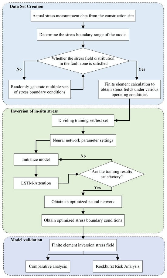 If the dimension of the subspace of measured data is lower than that of the calculated stress, the stress field can be inverted through use of MLR or a genetic algorithm. However, due to the high dimension and strong non-linear characteristics of deep geostress data [,], the dimension of its subspace is generally higher than that of the calculated stress, which renders the inversion more difficult. To solve the problem, an inversion method of geostress fields on the basis of the LSTM–Attention neural network algorithm was proposed to improve the inversion accuracy by dimension reduction of the sample subspace and deep optimization of the basis subspace (subspace of calculated stress). The process is illustrated in Figure 1.