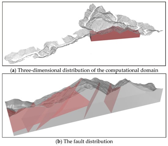 The vertical displacement on the bottom of the model was fixed, the upper ground was set as a free face, and the normal constraint was applied to the side face. On the basis of the measured geostress data, 10 groups of boundary conditions of uniformly distributed compressive stress and linearly increasing compressive stress were applied to different side faces (Table 5). All of the 10 groups of working conditions should meet the demarcation range of the stress field of faults [].
