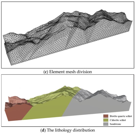 Two principles should be followed to determine the computational domain: (1) The geometric range should completely cover the engineering affected zone and be appropriately enlarged to reduce the boundary effect. (2) The geometric constraints at the boundary should be easy to determine []. Based on the range of the engineering area and the engineering geological condition, the computational domain is ascertained to be a rectangular plane domain with a long axis of 12,320 m and a short axis of 2060 m, as shown in Figure 3a. The powerhouse chamber is 600 to 1000 m from the fault zone, where secondary faults and joint fissures are relatively well developed. NNW and NNE-trending faults are mainly developed along the chamber. According to statistical results pertaining to such faults (Table 1), representative faults are taken for geostress simulation. The fault distribution is illustrated in Figure 3b. Through finite element mesh division, 121,130 elements and 59,843 nodes are generated, as displayed in Figure 3c. The lithological distribution in the computational domain is displayed in Figure 3d. Mechanical parameters of rock masses and faults are listed in Table 2 and Table 3.