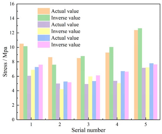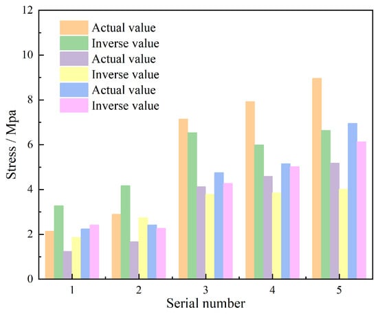 The comparison between measured values and inverted values is shown in Table 7. Table 7 indicates that the root mean square error (RMSE), mean absolute percentage error (MAPE), and mean absolute error (MAE) for the maximum principal stress, intermediate principal stress, and minimum principal stress are all close to 0, and the correlation coefficient R2 is above 0.88. The comparison of inversion accuracy for different principal stresses shows that the minimum principal stress > intermediate principal stress > maximum principal stress, further verifying the reliability of the model.