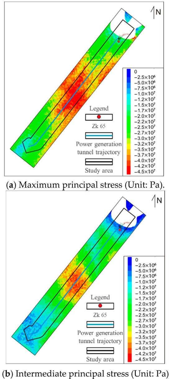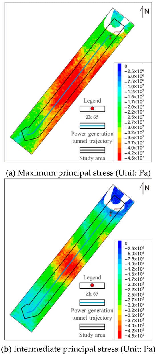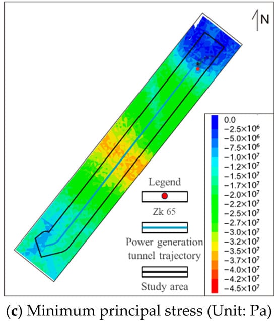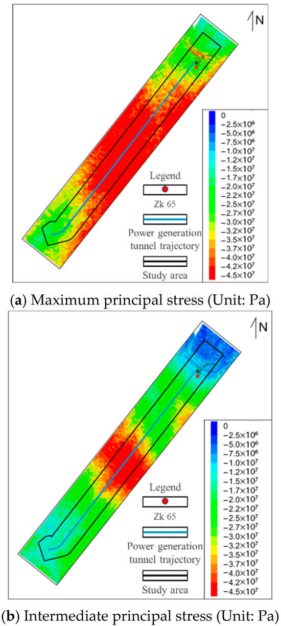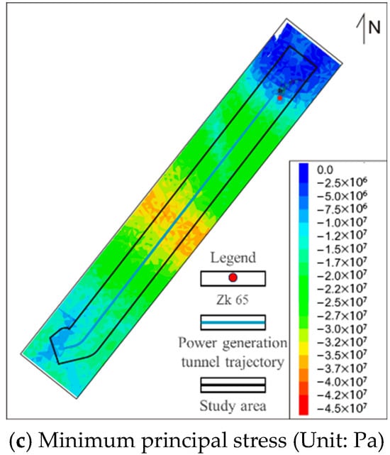 (2) The three-dimensional inversion of the initial stress field around the power generation tunnel at the upstream dam site of the Sangpile Hydropower Station reveals the following findings: A comparison between the measured stress values from boreholes ZK65, ZK59, and ZK60 and the inverted values demonstrates a high degree of consistency, confirming the reliability of the inversion results. Furthermore, the in situ stress field in the engineering area is predominantly governed by self-weight and topographical features. Specifically, in areas with thicker overlying strata, the in situ stress values exhibit an increase, accompanied by variations in the direction of the principal stress.