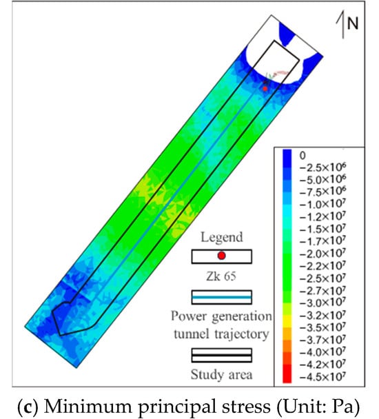 Table 6 and Figure 4, Figure 5 and Figure 6 list inversion and measured values of geostress components in the ZK59, ZK60, and ZK65 boreholes. The inversion values of geostress at the measuring points highly agree with the measured values, and the average errors of the maximum principal stress, intermediate principal stress, and minimum principal stress are separately 0.45 MPa, 0.29 MPa, and 0.23 MPa, indicative of a high inversion accuracy and reliable results.